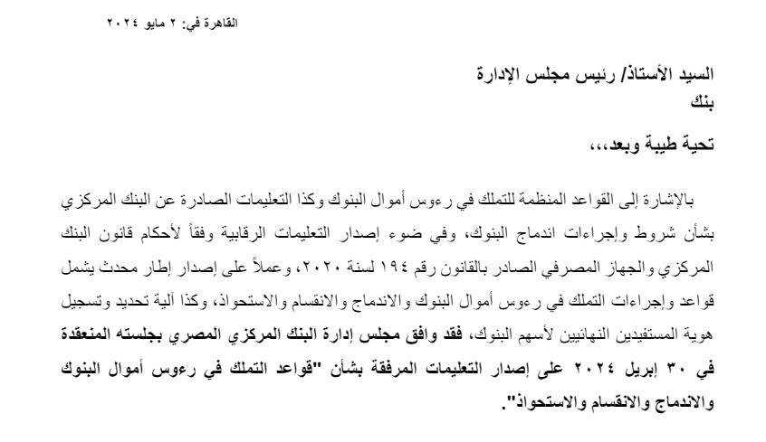 أصدر البنك المركزي المصر ي اليوم الخميس الموافق 2 مايو 2024 كتابًا دوريًا، بالإشارة إلى القواعد المنظمة للتملك في رءوس أموال البنوك وكذا التعليمات الصادرة عن البنك المركزي بشأن شروط وإجراءات اندماج البنوك.