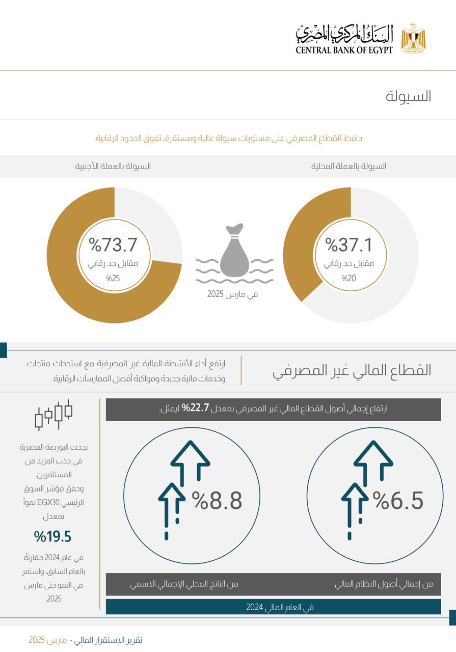 وسلط التقرير الضوء على استمرار القطاع المصرفي في توفير التمويل بالعملة الأجنبية، مع انخفاض احتمالية تعرضه للمخاطر النظامية المتعلقة بالخروج المفاجئ لرؤوس الأموال الاجنبية. ويأتي ذلك في ضوء وفرة النقد الأجنبي داخل القطاع المصرفي، نتيجة ارتفاع الصادرات غير البترولية والإيرادات السياحية، وتحويلات العاملين بالخارج، والاستثمارات الاجنبية المباشرة طويلة الاجل، مما انعكس في التحسن في صافي الاحتياطيات الدولية بالعملة الأجنبية ليصل إلى 47.8 مليار دولار في مارس 2025، ليستمر في تغطية الدين الخارجي قصير الأجل بصورة كافية وأكثر من ستة أشهر من الواردات السلعية.